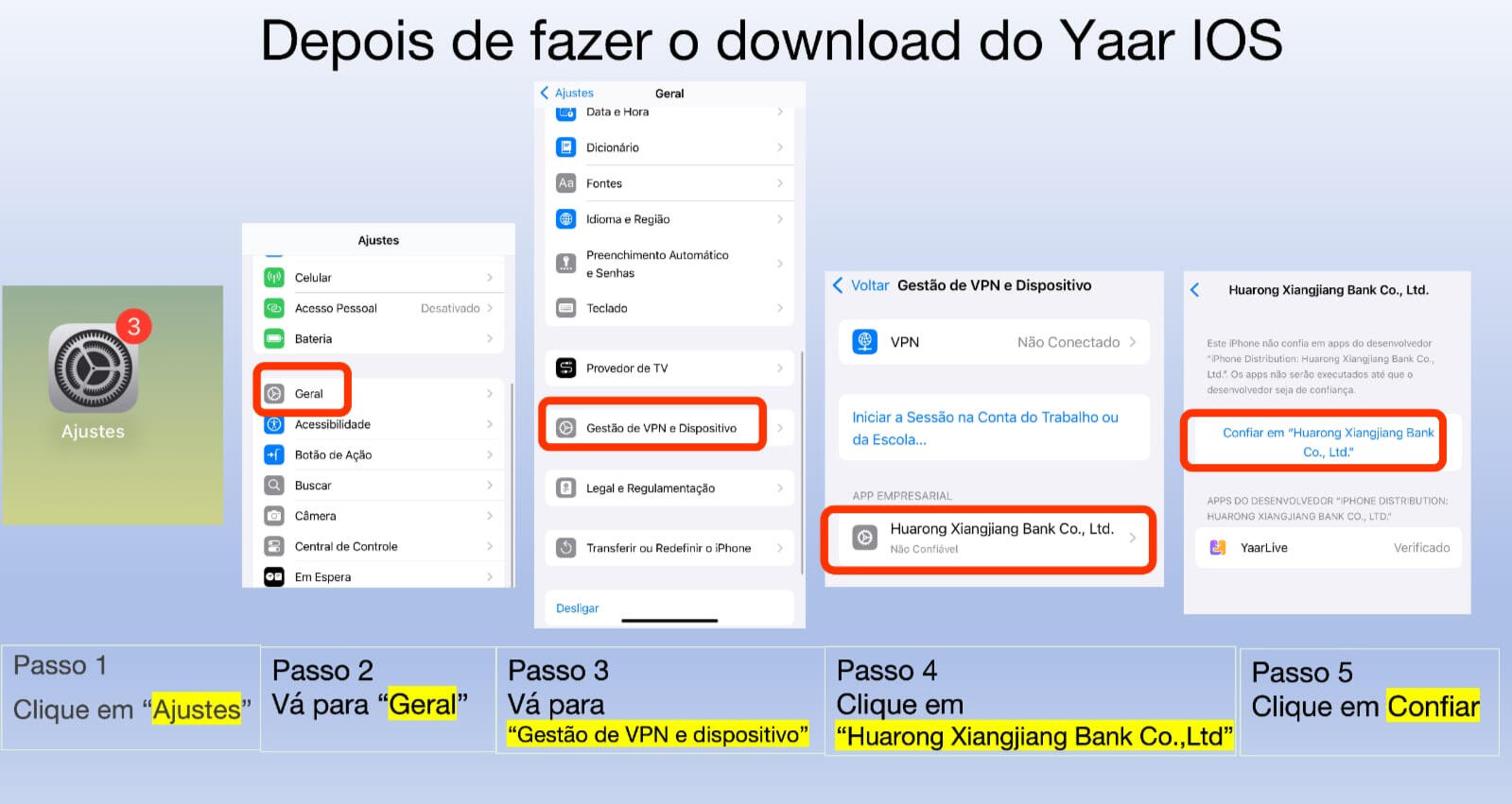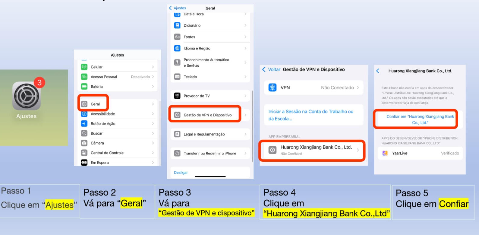 Atenção: Por ser um app internacional, seu iPhone pedirá uma autorização. Siga os 5 passos da imagem abaixo para liberar o acesso com segurança.